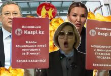 На этот раз Гульнара Бажкенова вышла на открытый бой с «Каспи банком» не с зажатыми в руках гранатами, а с двумя выполненными в фирменном цвете плакатами, по одному в каждой руке. На одном под логотипом Kaspi.kz был текст про мошенничество с данными граждан в госбазе. На другом под таким же логотипом говорилось о взломе социальных сетей неугодных за 5 минут. Там и там внизу итожилось: «Безнаказанно!».