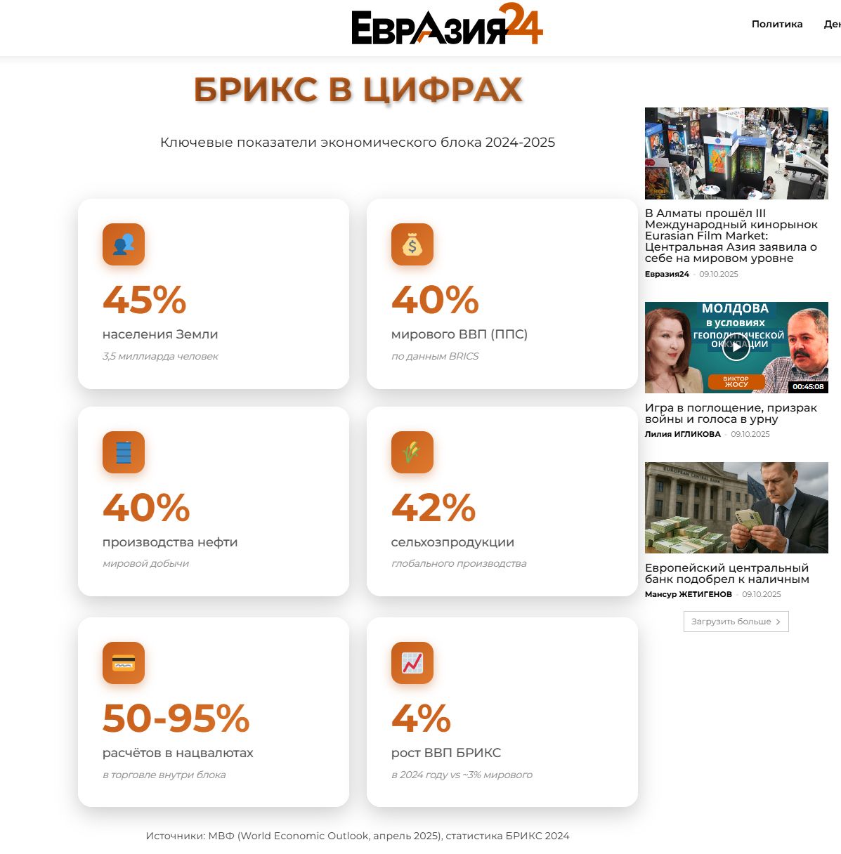 Но на самом деле удивительны в данном случае сразу два факта – что подобный тезис высказал представитель одной из стран G7, и то, что БРИКС и в самом деле превзошел G7 по совокупному ВВП, по паритету покупательной способности еще в 2023 году – 35,7% против 29%, а уже к 2024 году, по данным официальных источников БРИКС, доля объединения в мировой экономике по ППС достигла 40%, хотя независимые оценки МВФ дают чуть более консервативную цифру — в 36-37%.