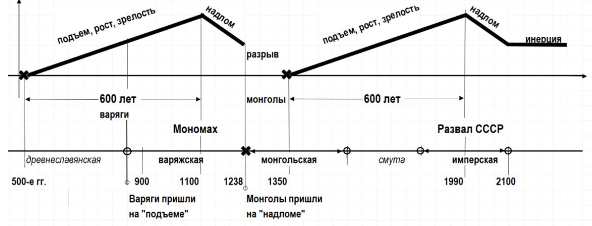 Похоже, что структурный подход к Истории, о котором мы говорим, снимает эти проблемы. Во-первых, этот подход всеобщий, он не разделяет исторические события на «свои» и «чужие». Во-вторых, он рассматривает усредненные исторические блоки («периоды» и «эпохи»), объективность которых гораздо выше, чем отдельных субъективных событий. Так, например, развал СССР не вызывает излишних эмоций, если «СССР» воспринимать как «период» в составе «имперской » эпохи России, имеющий заданную временну́ю размерность. И, в-третьих, совместное рассмотрение истории и этногенеза дает возможность хотя бы приблизительно прогнозировать некоторые исторические события, происходящие в пределах этногенетического цикла. Если фазы этногенеза (принятые по Гумилеву) должным образом синхронизированы с историей, мы получаем объективную картину с определенными предсказательными возможностями. Построим для этого «кривую этногенеза» (в упрощенном виде) и несколько ее точек (зарождение этноса, надлом и начало инерционной фазы) соотнесем с событиями на исторической шкале:
