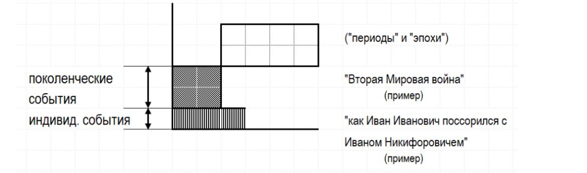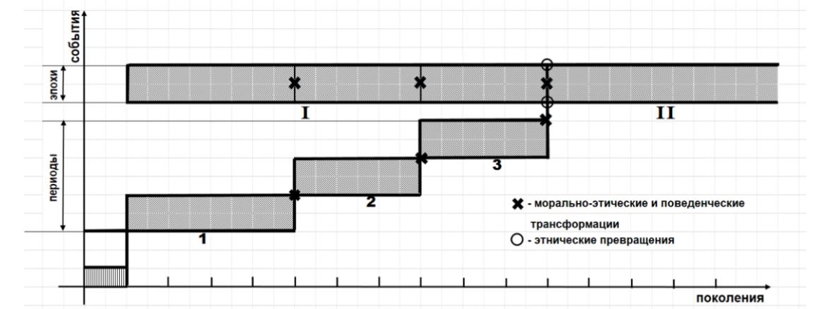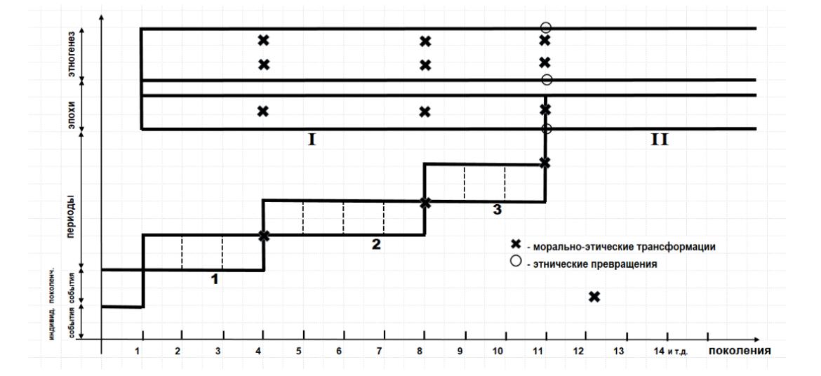 На этом графике показано, как отдельные события (индивидуальные и поколенческие) переходят в исторические структуры: периоды, эпохи, заканчивающиеся этногенезом. При этом соблюдается определённое структурное правило: каждый период состоит из 3 – 4 поколений, эпоха – из 3-4 периодов и этногенез происходит в результате этнических превращений 3 – 4 «народов», олицетворяющих эпохи.