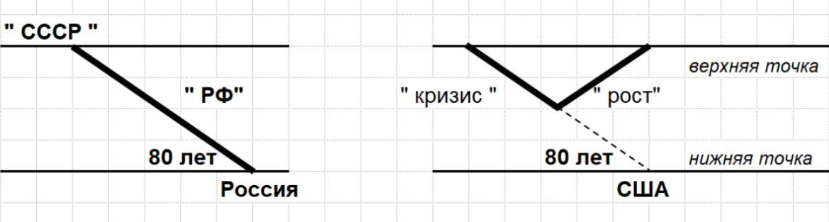 Связано это с тем, что российский «период» является реальной физической структурой (под названием «РФ»), а американский «период» оказывается эфемерным (виртуальным) образованием в форме колебательного цикла: падение – подъем (кризис – рост). Как Ванька- встанька: упал – поднялся, упал – поднялся. Природа этой разницы подлежит изучению, но можно предположить, что в ней кроется основное отличие США от России – в государственном устройстве, в экономике, в социальной и политической сферах, в образе жизни людей, наконец. Как скажется это различие на отношениях двух стран неизвестно, но оно может оказаться немаловажным обстоятельством в рамках мировой политики и проявится в ближайшие десятилетия.