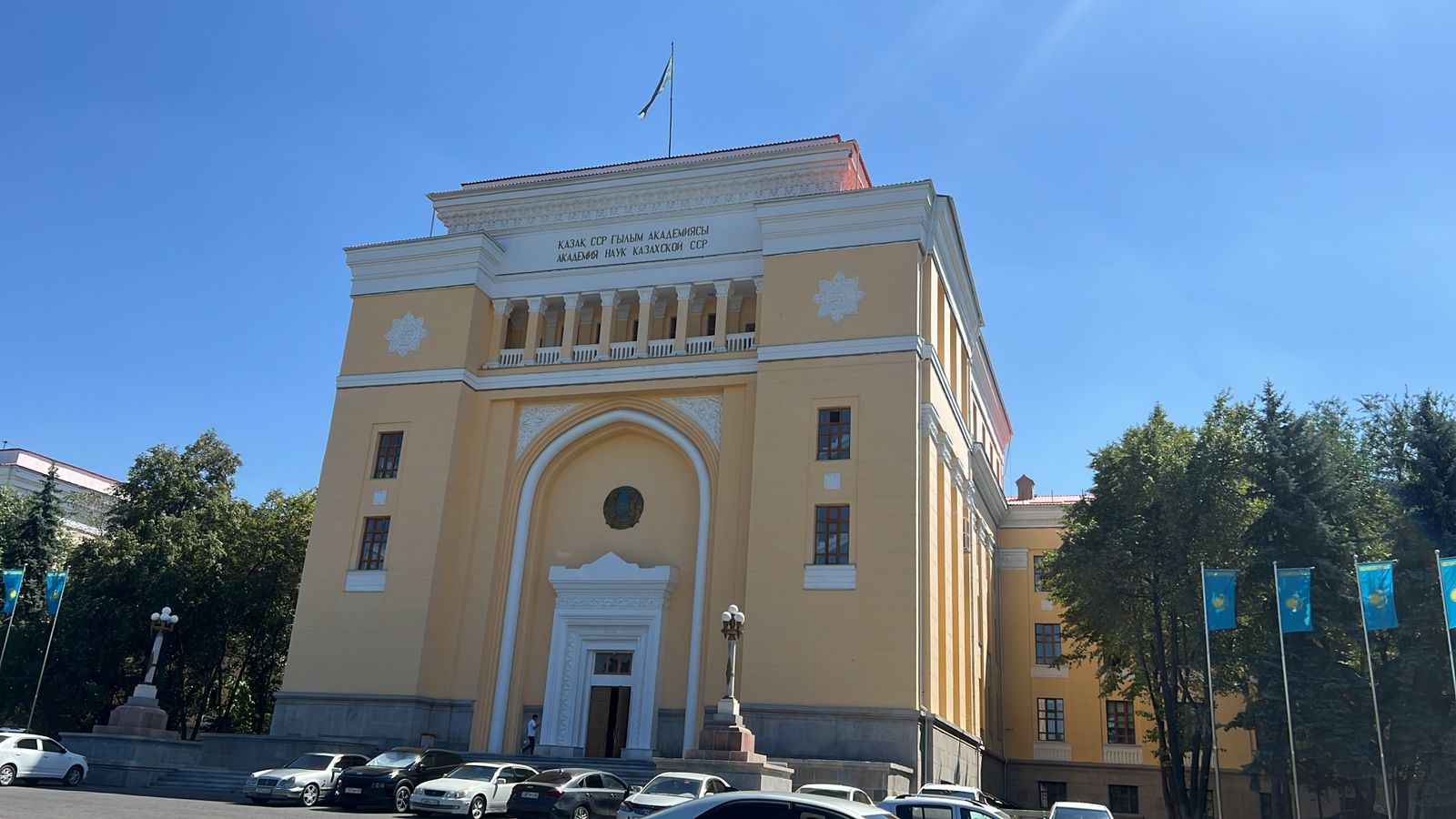 Шутка ли, здание Академии наук Казахской Советской Социалистической Республики по проекту самого академика Щусева было воздвигнуто в 1951-1954 годах и с тех пор на его фронтоне гордо красуется Қазақ ССР Ғылым академиясы — Академия наук Казахской ССР.