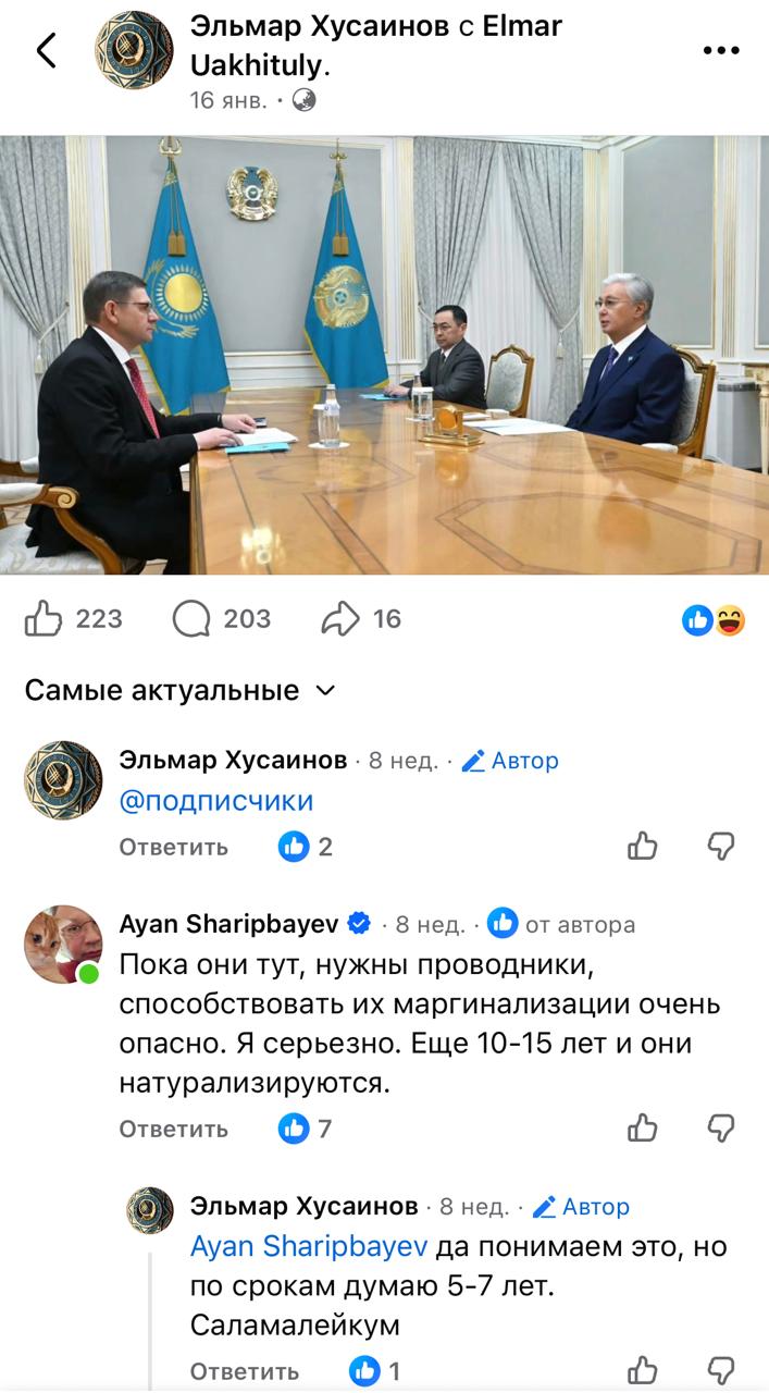 Под постом блогера Хусаинова о встрече главы АРСК – Ассоциации славянских, русских и казачьих организаций депутата Пономарева (того самого, прославившегося «игрой в стаканчики») с Президентом множество комментариев. В том числе отметился и журналист Аян Шарипбаев, а это уже интересно. Аян – сын Гульжан Ергалиевой, достойное продолжение своей матери и ее дела, нашедший себя в проекте «Елмедиа», как основной ведущий. Сама площадка «Елмедиа» хороша тем, что имеет свои «источники», о чем не забывает напоминать, а послушать, действительно, интересно. Сила же самого Аяна еще и в умении сопровождать профессионально составленные тексты выразительной мимикой лица и красноречивыми жестами тела.